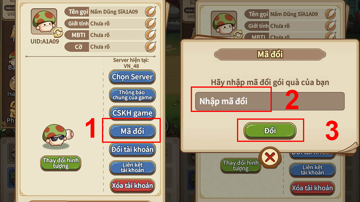 - Bước 3: Tiếp theo, nhấn chọn mục Mã đổi như hình hướng dẫn. Sau đó, tiến hành nhập mã code Nấm Lùn Tiến Lên mới nhất vào Nhập mã đổi. Cuối cùng, để nhận giftcode, hãy nhấn vào nút Đổi nhé.