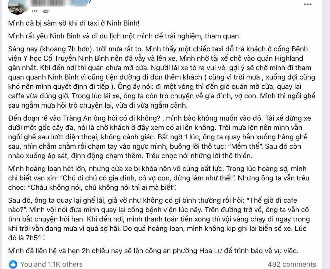 Sáng 22.9, trên mạng xã hội Facebook lan truyền thông tin một người phụ nữ đi du lịch tại Ninh Bình tố bị tài xế taxi sàm sỡ.
