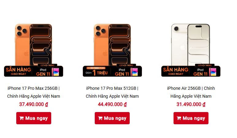 Về phần cứng, dòng Pro và Pro Max được trang bị chip A19 Pro với GPU mạnh mẽ, tối ưu cho game và xử lý AI. iPhone 17 và Air vẫn duy trì hiệu năng mạnh mẽ, đủ đáp ứng hầu hết nhu cầu. Đáng chú ý, Apple đã bỏ hẳn dung lượng 128GB, tất cả model đều khởi điểm từ 256GB. Điều này khiến giá bán khởi điểm cao hơn so với thế hệ trước, nhưng đổi lại người dùng được hưởng dung lượng lưu trữ lớn hơn.