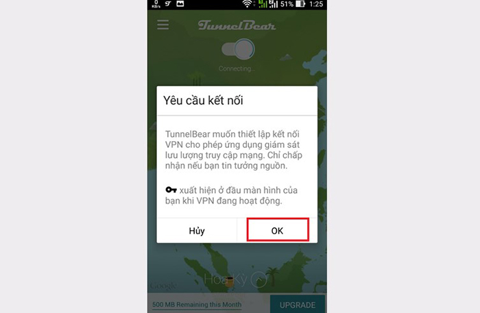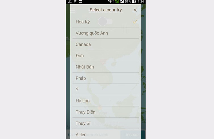 Bước 4: Tiếp đó bạn chạm vào nút công tắc phía trên để tiến hành kết nối, ứng dụng này nói một cách đơn giản là sẽ làm cho Google Play Store hiểu lầm bạn đang ở quốc gia mà bạn đã chọn trước.