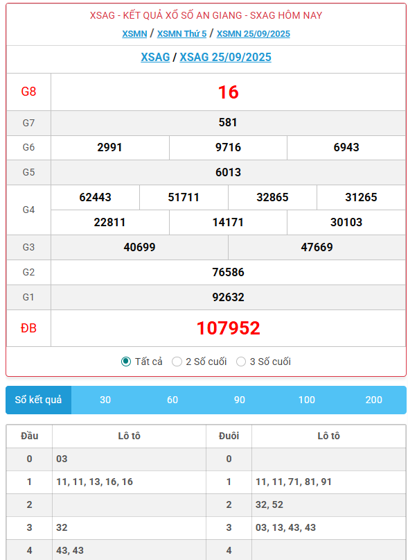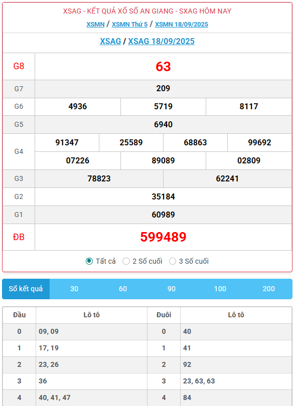 XSAG 9/10 Xổ số An Giang được phát hành bởi công ty xổ số kiến thiết An Giang, quay thưởng vào lúc 16h10 thứ Năm hàng tuần. Trực tiếp kết quả XSAG cập nhật nhanh nhất.