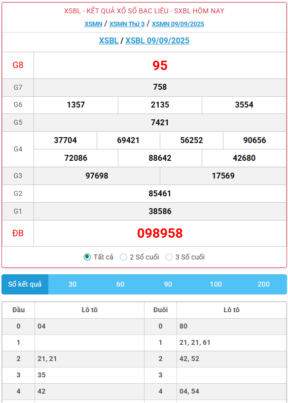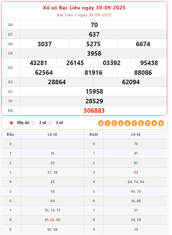 Kết quả xổ số Bạc Liêu ngày 30/09/2025