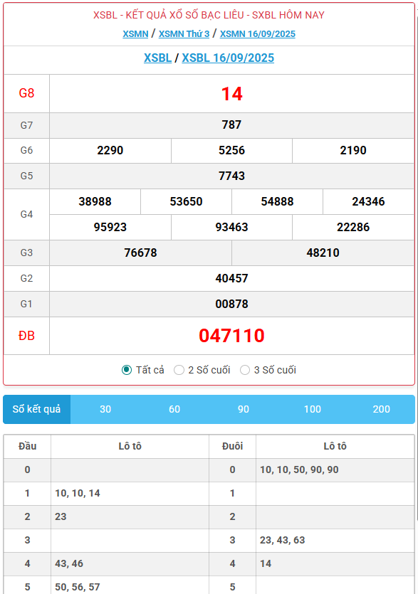 Kết quả xổ số Bạc Liêu ngày 16/09/2025