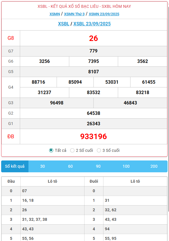 Kết quả xổ số Bạc Liêu ngày 23/09/2025