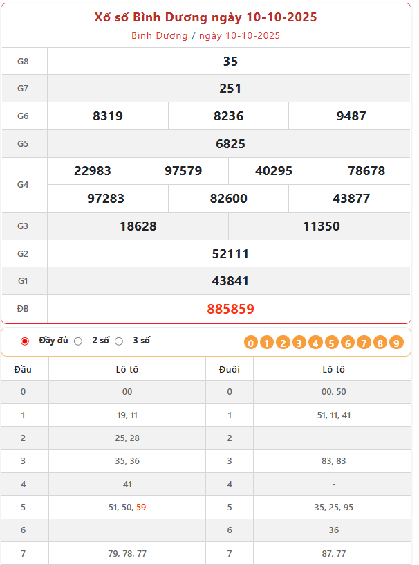 Kết quả xổ số Bình Dương ngày 10/10/2025