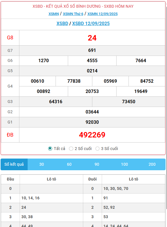 Kết quả xổ số Bình Dương ngày 12/09/2025