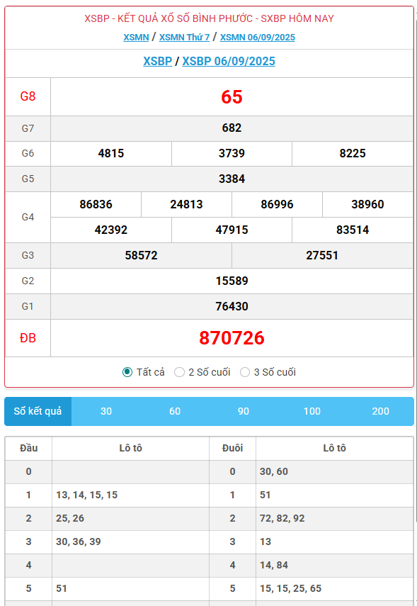 Kết quả xổ số Bình Phước ngày 6/09/2025