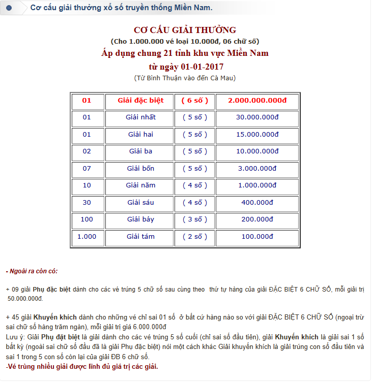 ✅ Với loại vé 6 số giá 10.000 đồng, cơ cấu giải thưởng xổ số Bình Phước gồm các giải sau