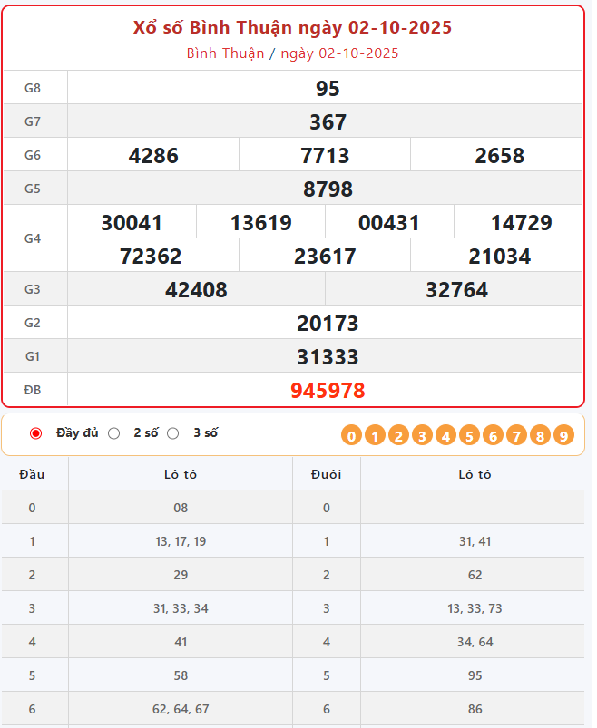 Kết quả xổ số Bình Thuận ngày 2/10/2025