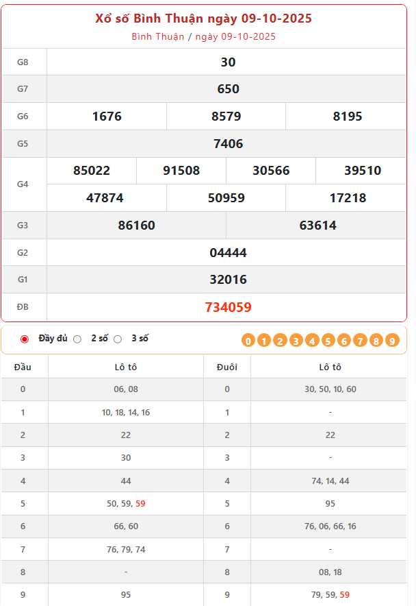 Kết quả xổ số Bình Thuận ngày 09/10/2025