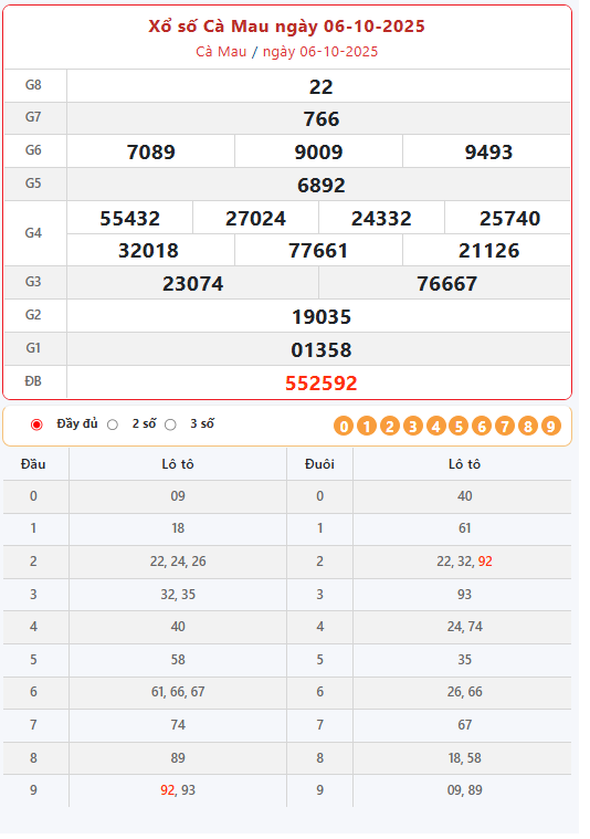 Kết quả xổ số Cà Mau ngày 06/10/2025