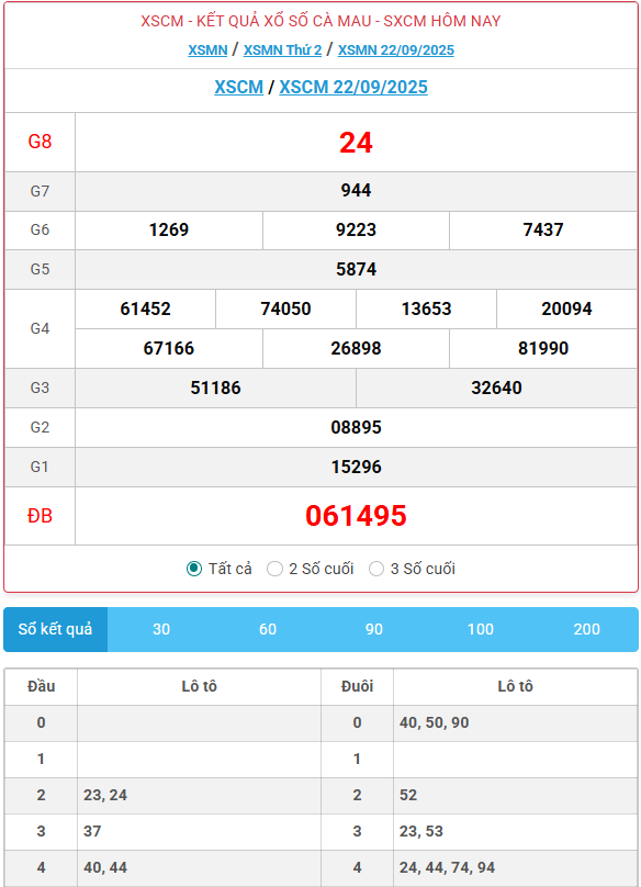 Kết quả xổ số Cà Mau ngày 22/09/2025