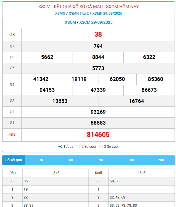 Kết quả xổ số Cà Mau ngày 29/09/2025