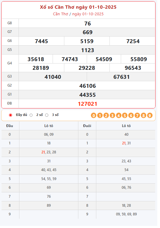 Kết quả xổ số Cần Thơ ngày 1/10/2025
