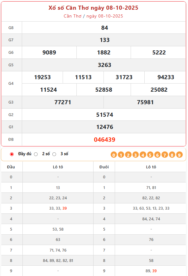 Kết quả xổ số Cần Thơ ngày 8/10/2025