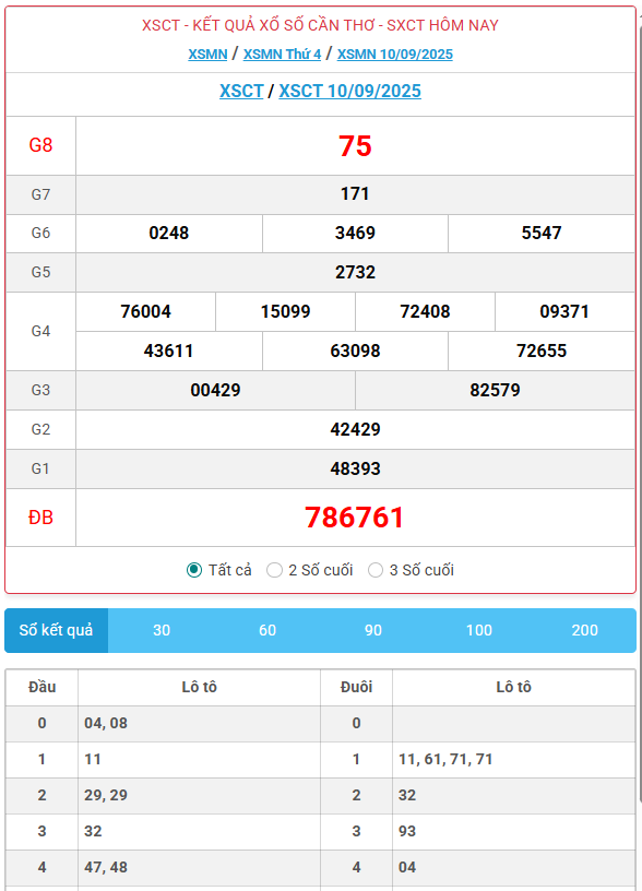 Kết quả xổ số Cần Thơ hôm trước ngày 10/09/2025