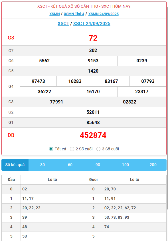 Kết quả xổ số Cần Thơ ngày 24/09/2025