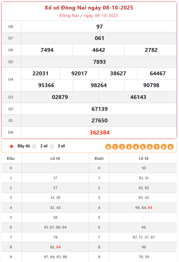 Kết quả xổ số Đồng Nai ngày 08/10/2025