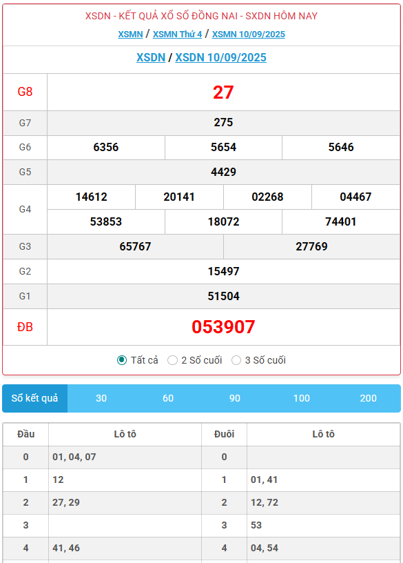 Kết quả xổ số Đồng Nai hôm trước ngày 10/09/2025