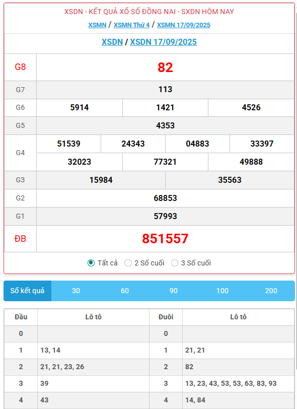 Kết quả xổ số Đồng Nai ngày 17/09/2025