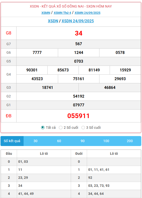 Kết quả xổ số Đồng Nai ngày 24/09/2025