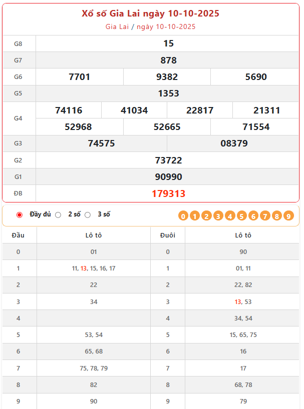 Kết quả xổ số Gia Lai ngày 10/10/2025