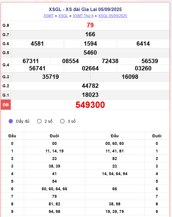 Kết quả xổ số Gia Lai tuần trước ngày 5/09/2025