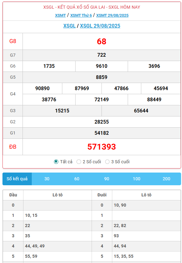 Kết quả xổ số Gia Lai tuần trước ngày 29/08/2025