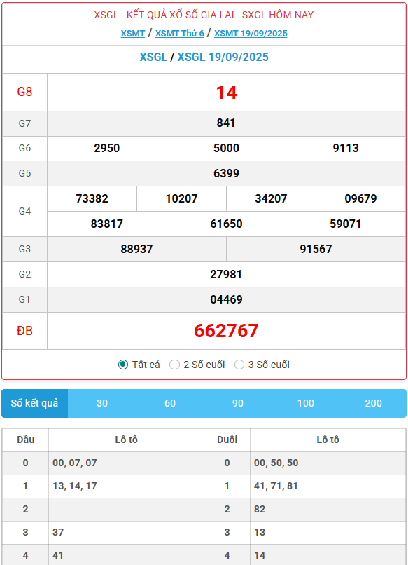 Kết quả xổ số Gia Lai ngày 19/09/2025