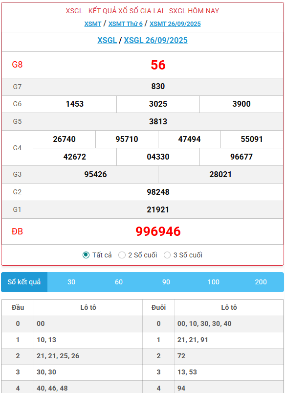 Kết quả xổ số Gia Lai ngày 26/09/2025