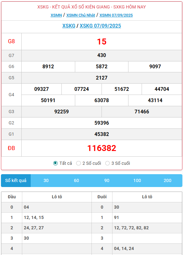 Kết quả xổ số Kiên Giang ngày 7/09/2025