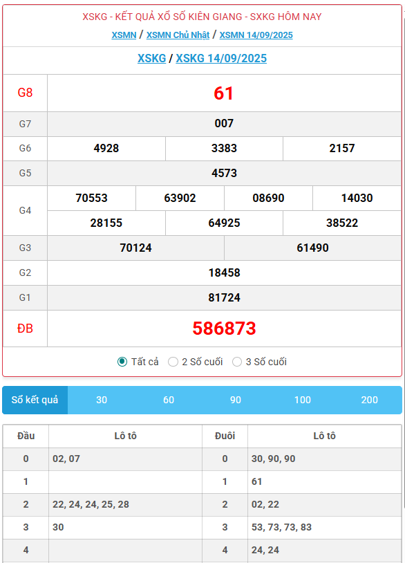 Kết quả xổ số Kiên Giang ngày 14/09/2025