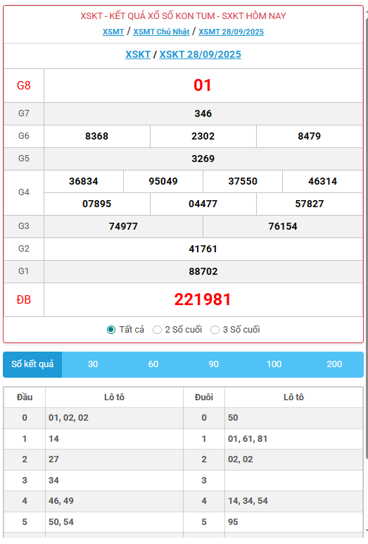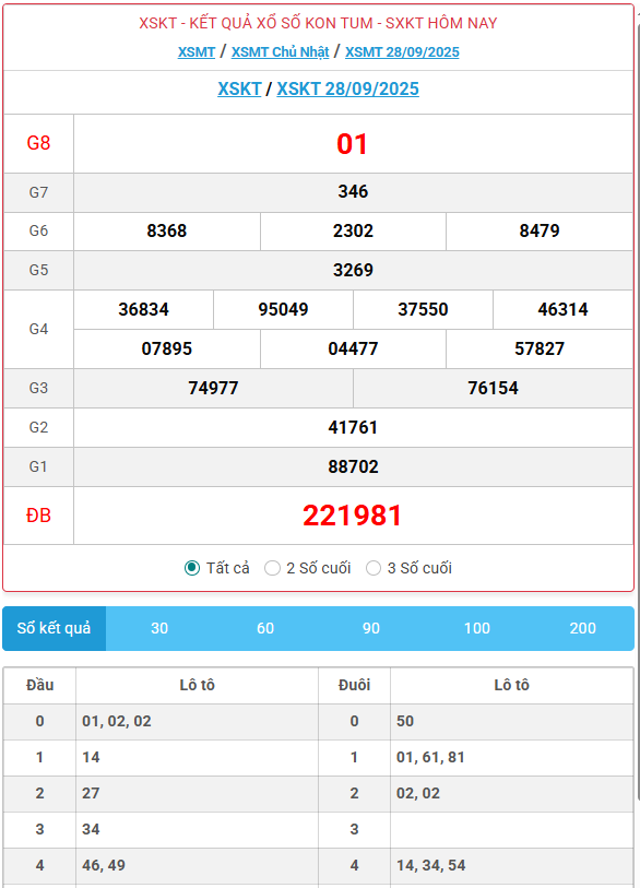 Kết quả xổ số Kon Tum ngày 28/09/2025