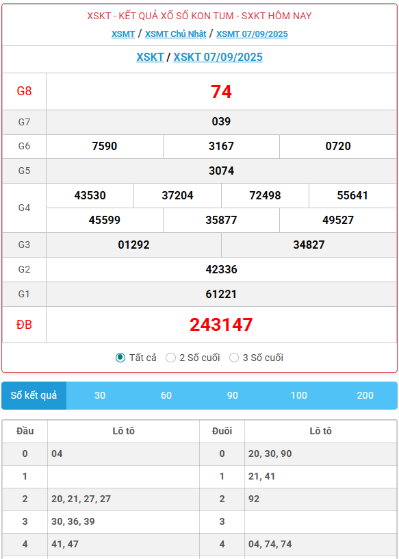 Kết quả xổ số Kon Tum ngày 7/09/2025