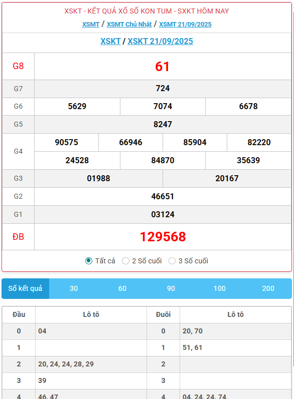 Kết quả xổ số Kon Tum ngày 21/09/2025