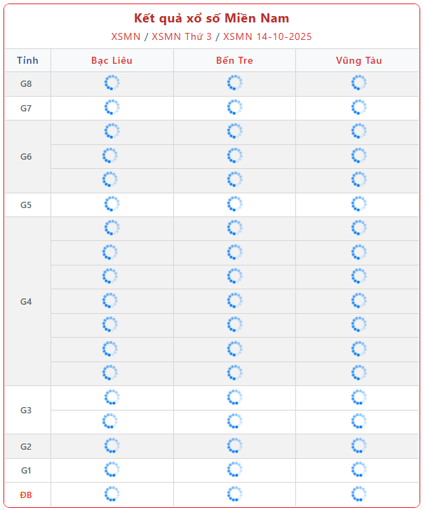 Xổ số Miền Nam hôm nay 14/10/2025 cập nhật kết quả từ ba tỉnh: Bạc Liêu, Bến Tre, Vũng Tàu. Hãy theo dõi kết quả nhanh chóng, chính xác để biết liệu bạn có trúng giải thưởng lớn. Đừng bỏ lỡ cơ hội thay đổi vận may của mình hôm nay!
