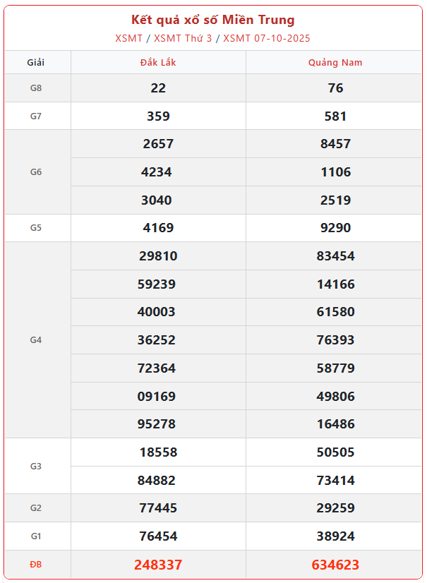 Thứ Ba: XSMT tiếp tục với hai đài Đắk Lắk (XSDLK) và Quảng Nam (XSQNA).
