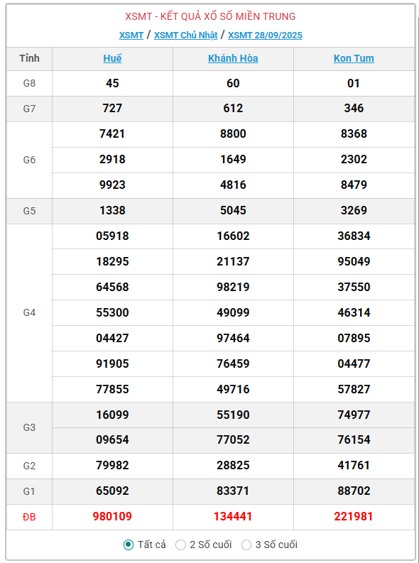 Chủ Nhật: Kết thúc tuần, XSMT được quay tại ba đài Kon Tum (XSKT), Khánh Hòa (XSKH) và Thừa Thiên Huế (XSTTH).