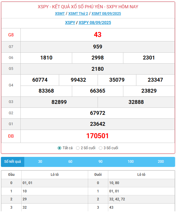 Kết quả xổ số Phú Yên ngày 08/09/2025