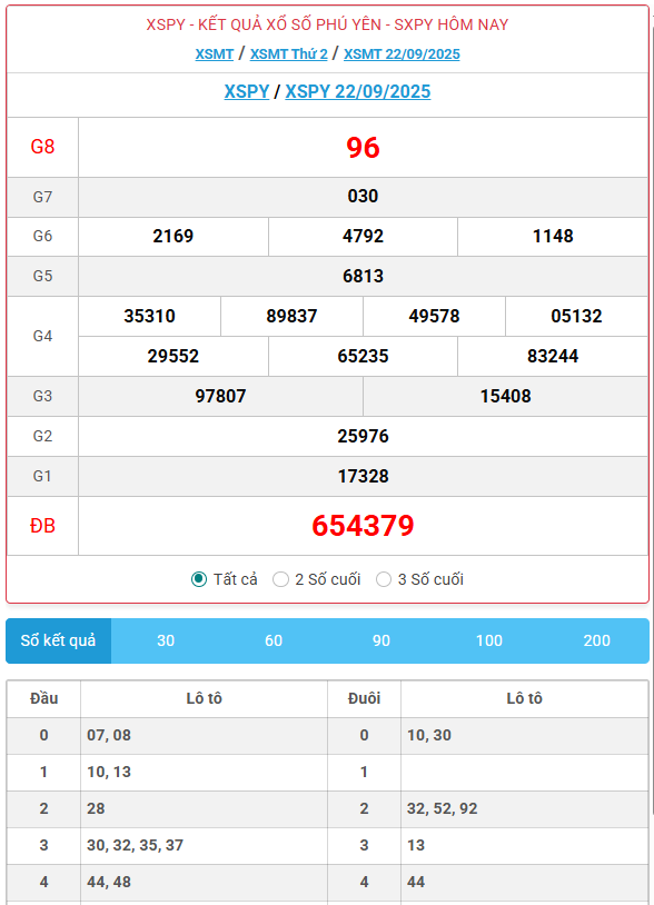 Kết quả xổ số Phú Yên ngày 22/09/2025