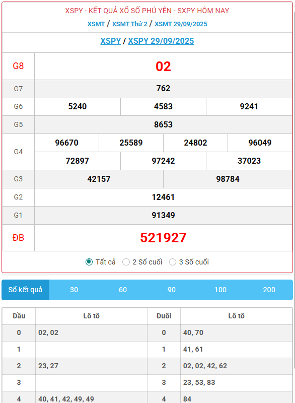 Kết quả xổ số Phú Yên ngày 29/09/2025