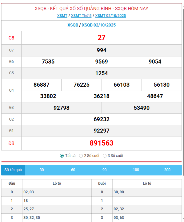 Kết quả xổ số Quảng Bình ngày 2/10/2025
