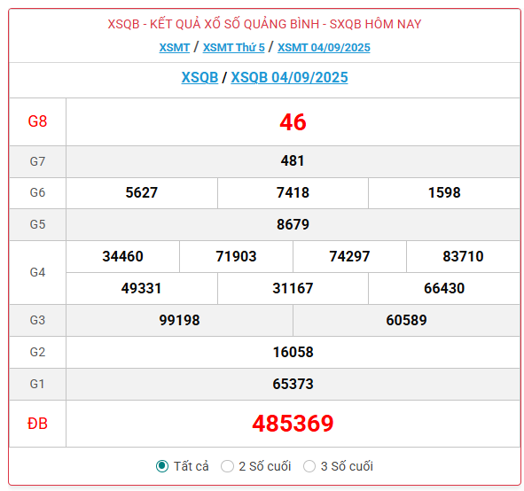 Kết quả xổ số Quảng Bình tuần trước ngày 04/09/2025