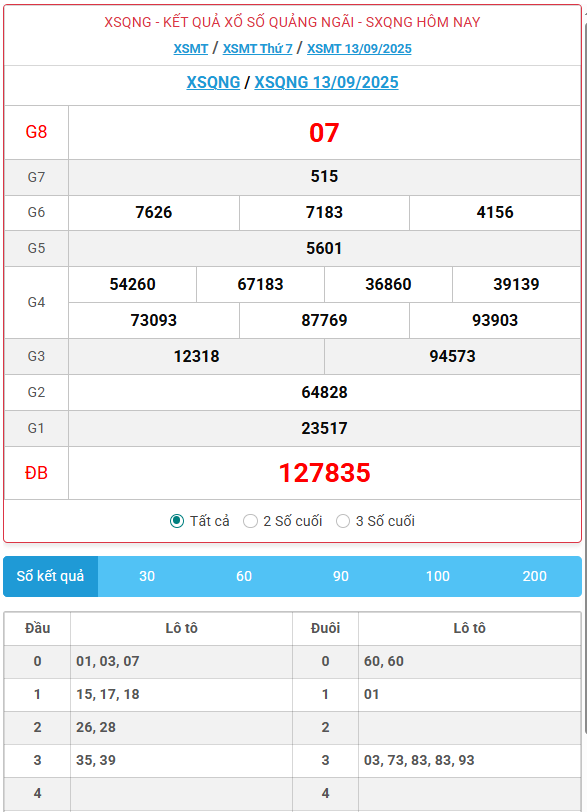 Kết quả xổ số Quãng Ngãi ngày 13/09/2025