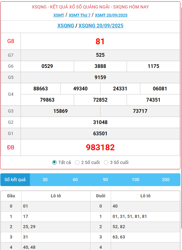Kết quả xổ số Quãng Ngãi ngày 20/09/2025