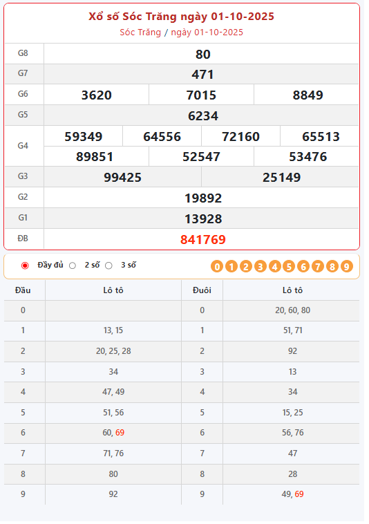 Kết quả xổ số Sóc Trăng ngày 01/10/2025