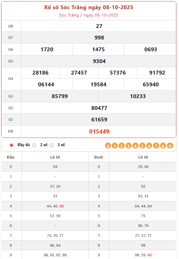 Kết quả xổ số Sóc Trăng ngày 08/10/2025