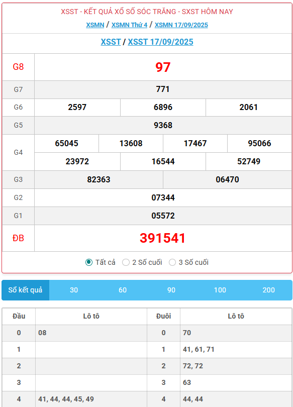Kết quả xổ số Sóc Trăng ngày 17/09/2025