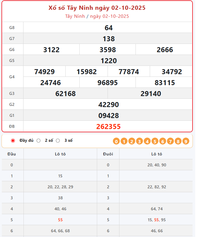 Kết quả xổ số Tây Ninh ngày 2/10/2025