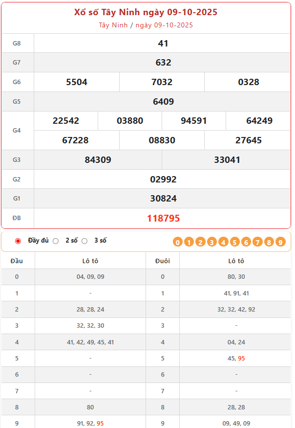 Kết quả xổ số Tây Ninh ngày 09/10/2025